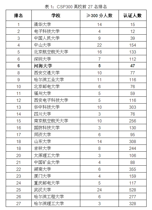 此次认证考试共有来自全国200多高校的6931人参加,满分500分。认证成绩400分以上的有44人,我校1人。认证成绩在300分以上且参加认证人数在10人以上的有39所院校,共238人。探花视频 排名第6,各校300分以上人数排名(CSP300)(见表1)。