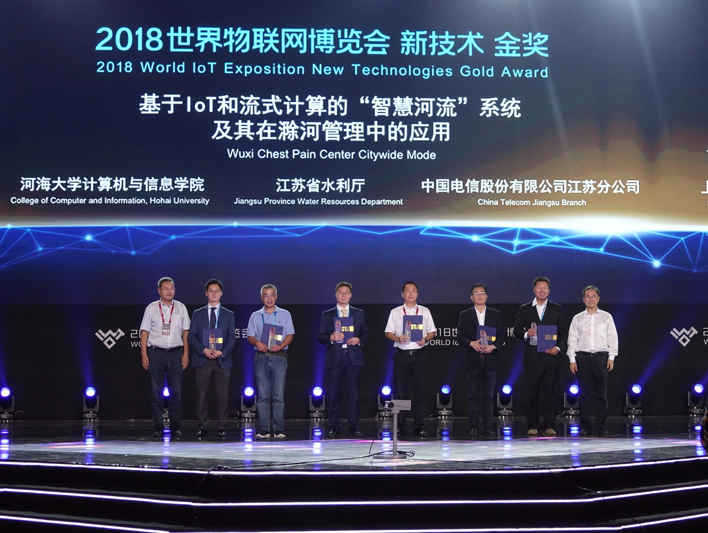 9月15日,2018世界物联网博览会新技术新产品新应用成果发布会在无锡举行。以探花视频 计算机与信息学院为主,联合江苏省水利厅、中国电信江苏公司研发并申报的“基于IoT和流式计算的‘智慧河流’系统”,获得大会金奖,并获得由多位院士组成的专家委员会的高度评价。王志坚教授代表整个项目团队领取了金奖奖杯和证书,学院领导张雪刚书记、叶保留院长作为获奖单位嘉宾也受邀参加了本次盛会。