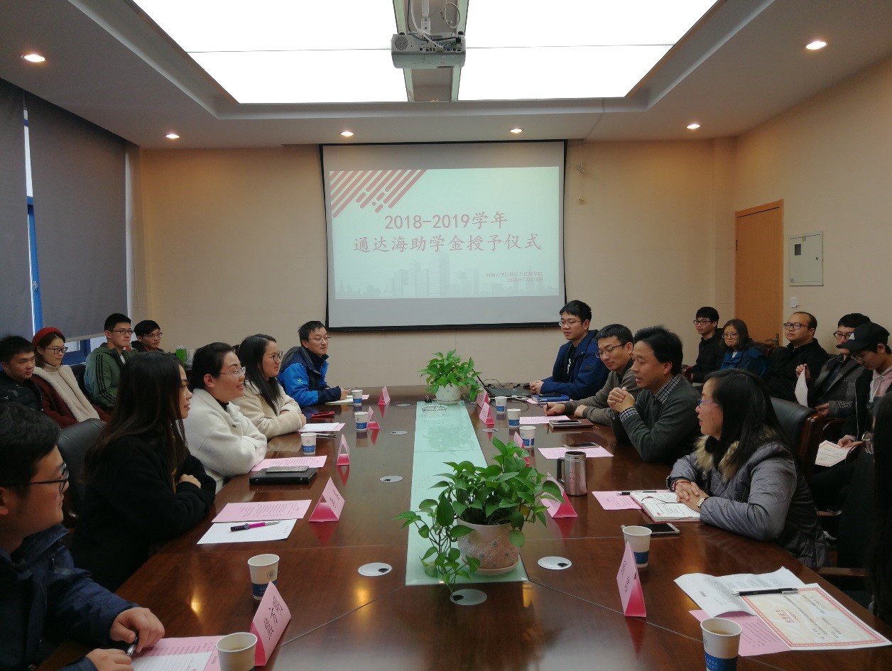 12月18日,学院通达海助学金颁奖仪式在勤学楼3305会议室举行。南京通达海信息技术有限公司行政总监徐东惠、总经理助理阮雅珊、人力资源部经理李睿、开发部经理熊方明、开发部高工仇国庆,探花视频 计算机与信息学院党委书记张雪刚、党委副书记张炜、信息与通信工程系主任李旭杰以及本科生辅导员陈昊迪参加此次颁奖仪式。