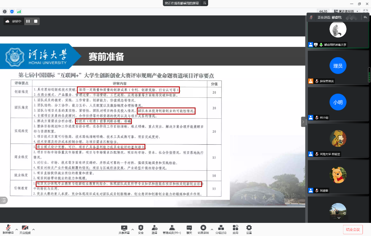 硕士研究生郦睿翔分享了关于参加“互联网+”大赛的经验。郦睿翔详细介绍了 “互联网+”大赛的性质、准备过程和参赛流程,并结合评审要点分享自己的参赛经验。他建议新生可以将学校优势学科、自己的科研项目等与比赛相结合,注重创新及团队交流。