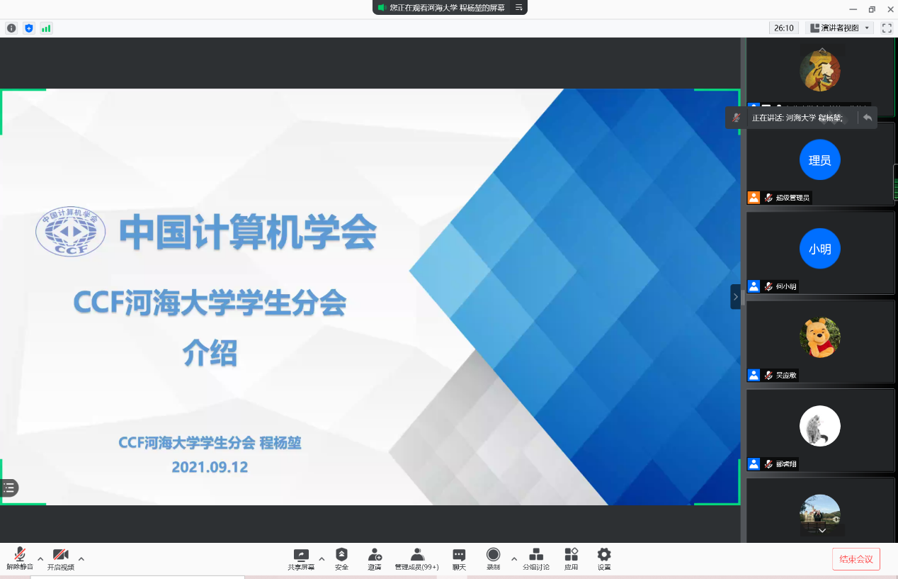 硕士研究生程杨堃介绍了中国计算机学会(CCF)及CCF探花视频 学生分会的详细情况,鼓励同学们积极加入CCF协会,为自己的研究生阶段增添更丰富的科研经历。