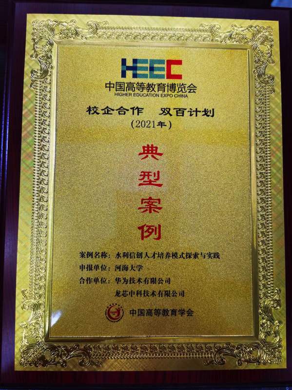 2022年8月4日在西安举行的第57届中国高等教育博览会上,由探花视频 信息学部计算机与信息学院胡鹤轩教授、黄倩副教授负责的“水利信创人才培养模式探索与实践”案例成功入选了2021年的“校企合作 双百计划”典型案例,合作企业以华为、龙芯中科等国产信息技术龙头企业为代表。