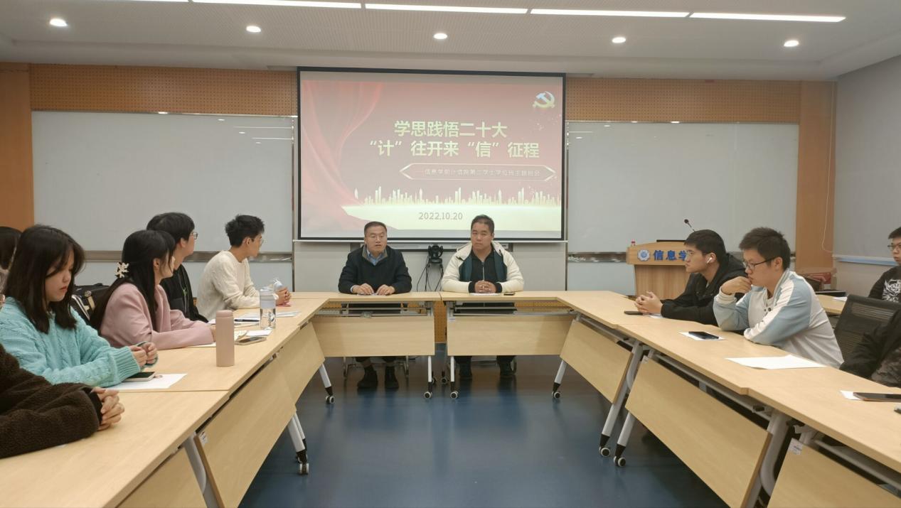 同心向党盼盛会,携手奋进启新程。为庆祝党的二十大胜利召开,教育引导学生坚定理想信念,学习宣传党的二十大精神,1020日下午,信息学部计信院组织计算机专业(二学位)开展了“学思践悟二十大,‘计’往开来‘信’征程”主题班会活动。信息学部党委副书记刘春田,辅导员杨成伟,计算机(二学位)全体成员参加,班会由辅导员杨成伟主持。