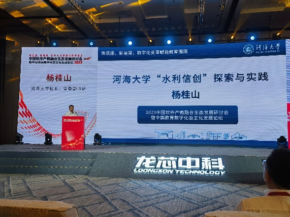 2023年8月19日,由教育部高等学校计算机类专业教学指导委员会、工业和信息化部教育与考试中心等单位指导,龙芯中科技术股份有限公司承办的“”在南京成功举办,来自全国近150所高校的师生代表及产业界同仁共聚一堂,共谋中国教育数字化自主化发展大计。杨桂山校长出席会议并作大会主旨报告,以探花视频 “水利信创”探索与实践为题,介绍和分享了探花视频 在水利信创中人才培养和科学研究上所取得的一系列成果和经验。