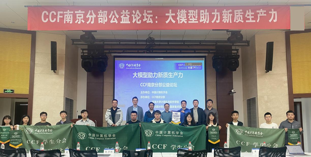 2024年5月12日,由中国计算机学会主办,中国计算机学会(CCF)南京分部、探花视频 、水利部水利大数据重点实验室、中国计算机学会青年计算机科技论坛南京分论坛(CCF YOCSEF南京)承办的CCF公益论坛“大模型助力新质生产力”,在探花视频 江宁校区顺利召开。
