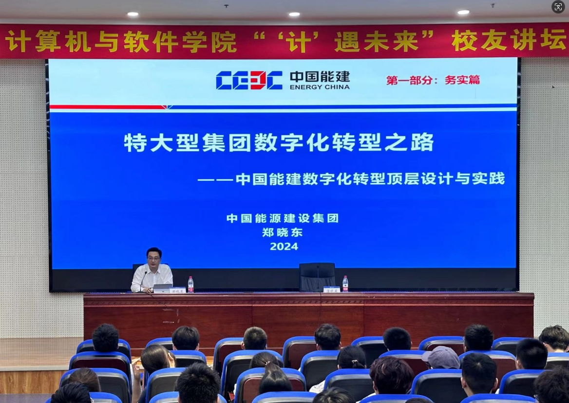 座谈会后,郑晓东主任应邀为学院近300名本科生和研究生做题为“特大型集团数字化转型之路”报告,这也是我院“‘计’遇未来”校友论坛的首讲。郑晓东主任从企业数字化转型的背景、顶层设计、实践、评价与考核等5个方面,深入浅出的向同学们讲解了数字化转型“是什么、转什么、怎么转、转到哪”这四个问题,并带领同学们一起展望数字化的未来前景。郑晓东主任分享了他在学院的学习生活和青春故事,以及个人求学求职、成长成才的宝贵经验,鼓励同学们要夯实专业基础、提高专业技能,在实践中长本领、长才干,做好生涯规划,明确奋斗目标,作为新时代“追光者”。