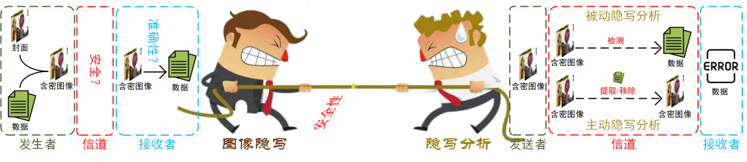 图像隐写作为网络与信息安全领域中的关键技术,旨在实现敏感信息在高风险、强对抗环境下的隐蔽安全传输。其应用场景覆盖诸如战场通信、情报传递、无人机集群协同、前线监控、突发事件应急指令传输等关键领域,广泛服务于国防安全、公共安全与边缘智能系统等实际需求。然而,随着对手攻击手段的不断演进,图像隐写的通信安全性正面临前所未有的威胁:一方面,深度学习推动被动隐写分析精准识别图像微小变动,显著提升了隐写检测能力,增加了通信行为暴露的风险;另一方面,主动攻击从传统干扰演变为图像“净化”,可彻底破坏嵌入信息,导致任务中断与决策失误。