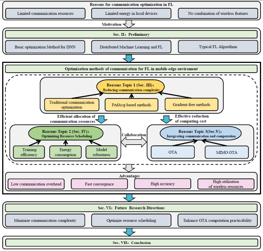 论文系统综述了移动边缘环境中联邦学习的通信效率提升方法,聚焦于通过降低通信复杂度、优化资源调度及利用空中计算三大方向来减少通信开销。同时,从收敛性与数据异构性视角分析如何优化算法性能以减少通信轮次,对未来研究进行了展望。