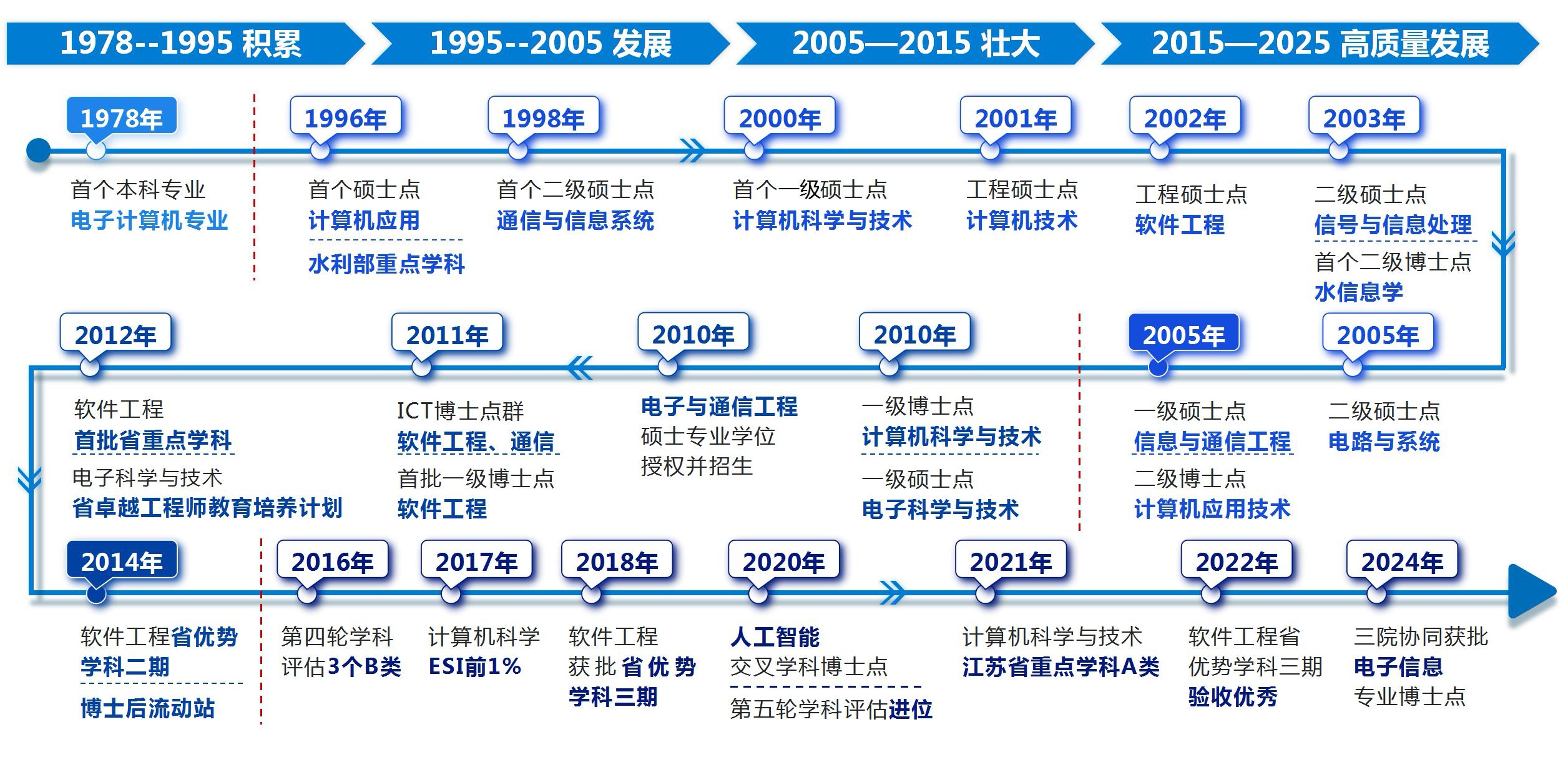 学院学科体系完善,拥有计算机科学与技术、软件工程两个一级学科博士点及博士后流动站,其中,软件工程连续三期入选江苏省优势学科,计算机科学与技术为江苏省重点学科(A类),计算机科学于2017年跻身ESI全球排名前1%。同时获批“电子信息”专业博士点,形成多元交叉的学科发展格局。